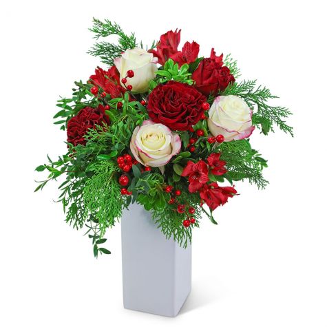 The rich, romantic colors of Cozy Wonderland are sure to melt the heart of your loved one. Beautiful ruffly roses, alstroemeria, and other premium flowers and winter foliage are artfully arranged in an on-trend white vase. Flower delivery has never been easier or more appreciated. Whether you are looking for a birthday, anniversary, or valentines day gift, we have flowers that are sure to fit the occasion!