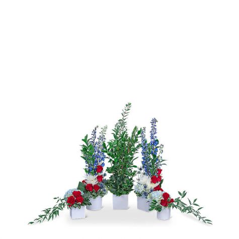 Our Honorable Tribute design is a popular choice for the funeral or celebration of life ceremony for the patriot you are honoring. Sympathy flowers for a veteran are beautifully shown in red, white, and blue funeral flowers. This patriotic theme is beautifully accomplished with five individual designs featuring a combination of Roses, Hydrangea, Spider Mums, Delphinium, Ruscus, Aspidistra, and other premium foliage. They come together to make a truly honorable tribute for your loved one.