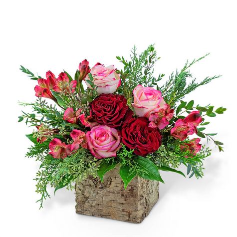 Add a little color to someone’s life with this beauty! Radiant Rouge contains Roses, Alstroemeria, Cocculus, Parvifolia, and Seeded Eucalyptus surrounded by Evergreen and displayed in a charming birch box. It’s the perfect birthday or anniversary gift.