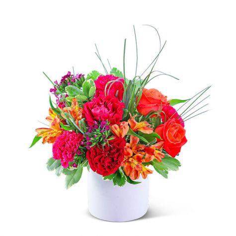 Add bold color to your life with our Tango in Paradise design. Our hand-arranged, floral design is the perfect way to show someone special how much you care. It features gorgeous reds, pinks, and oranges in a combination of Roses, Carnations, Alstroemeria, Dianthus, and premium foliage. This sweet, colorful arrangement is the perfect statement piece for a side table or desk.